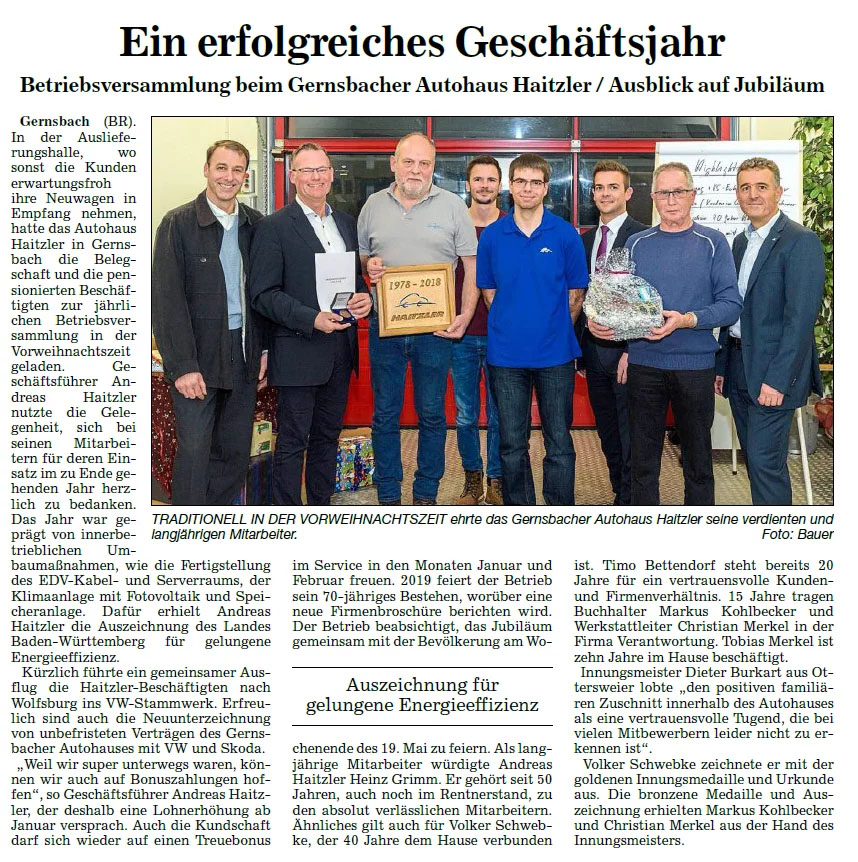 Das Bild zeigt eine Ehrung für ein erfolgreiches Geschäftsjahr 2018