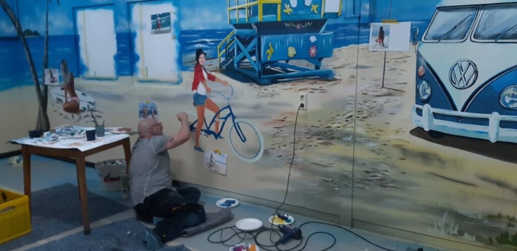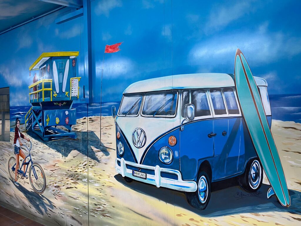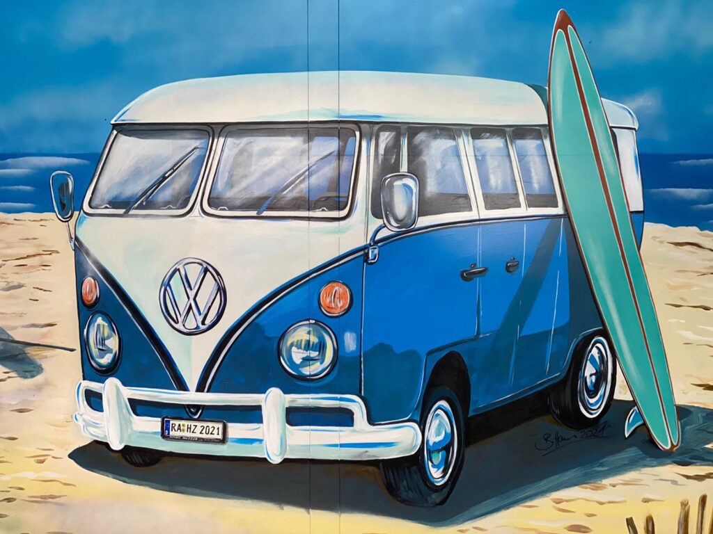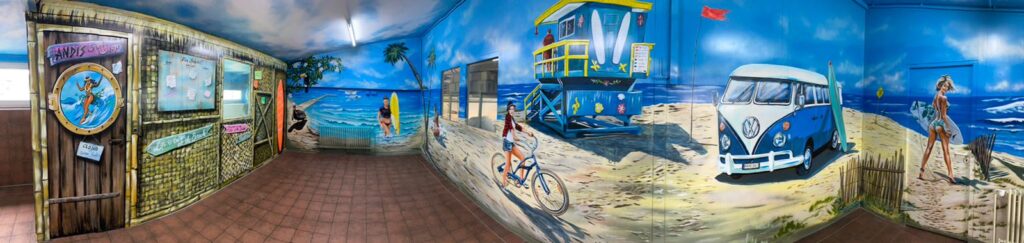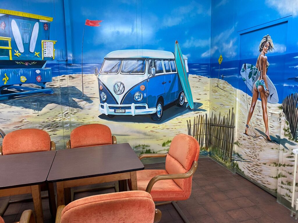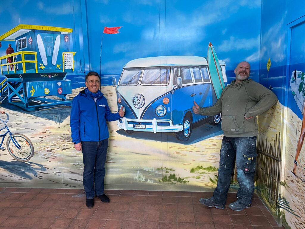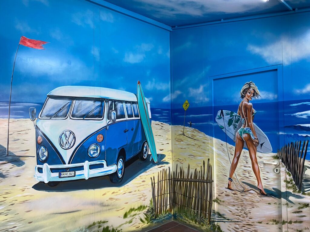 Denn Europapark Künstler Bernhard Hauns hat den Pausenraum in eine Bully-Beach & Gute-Laune Location verwandelt.
