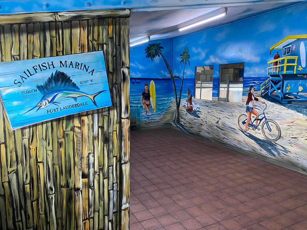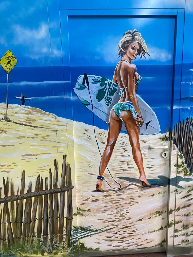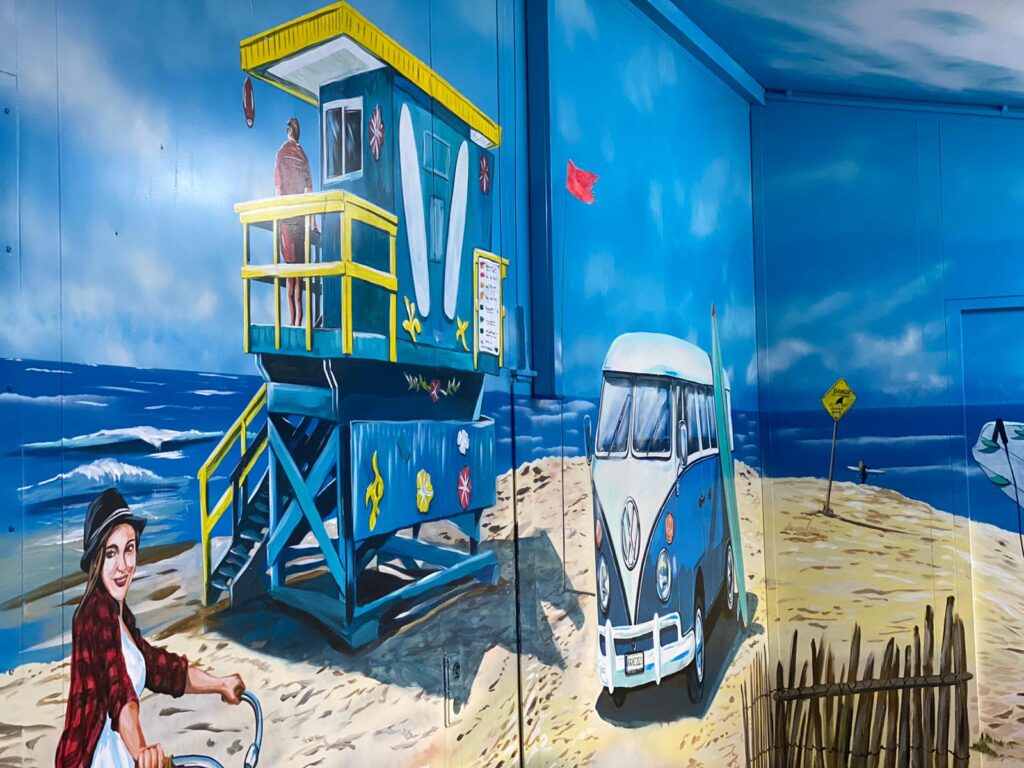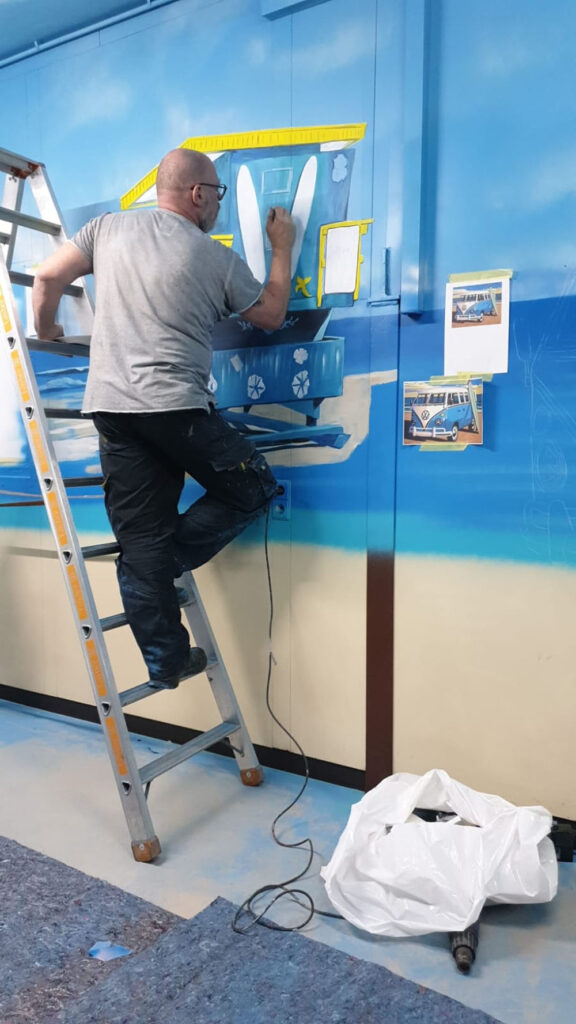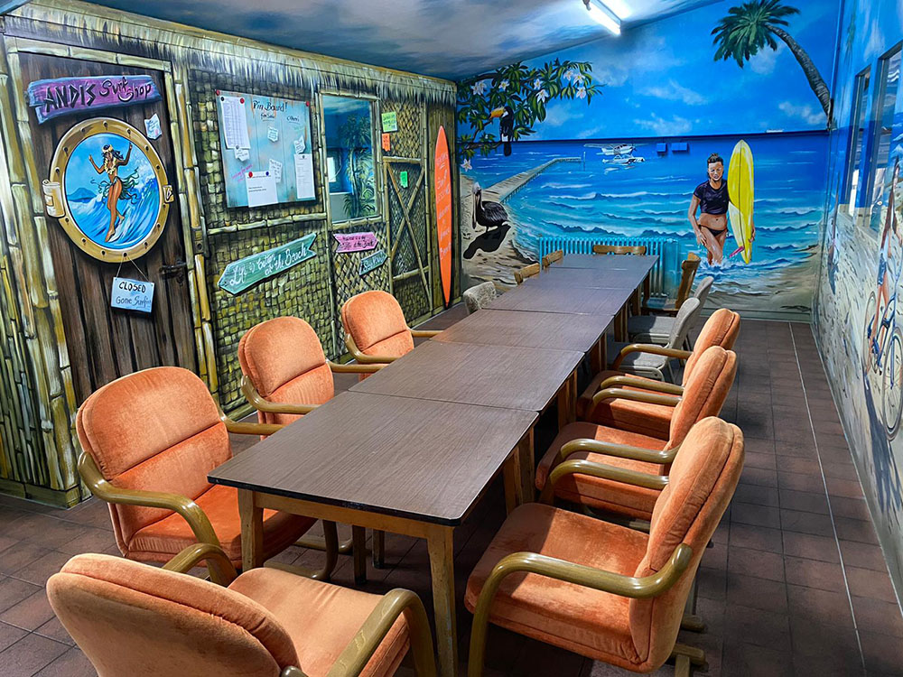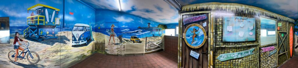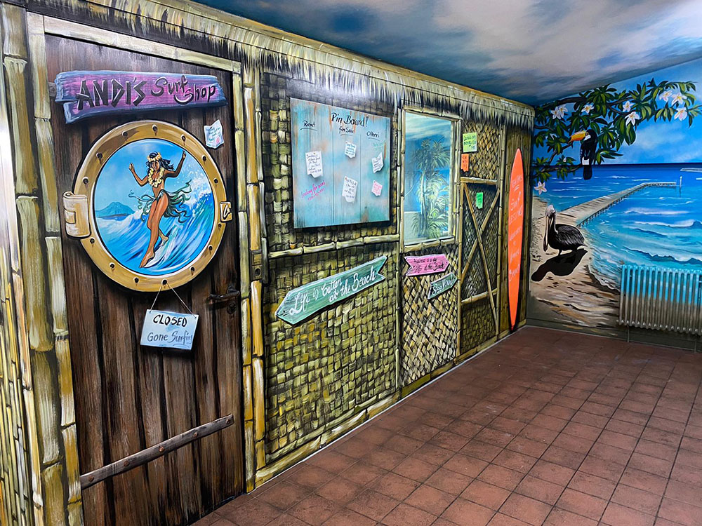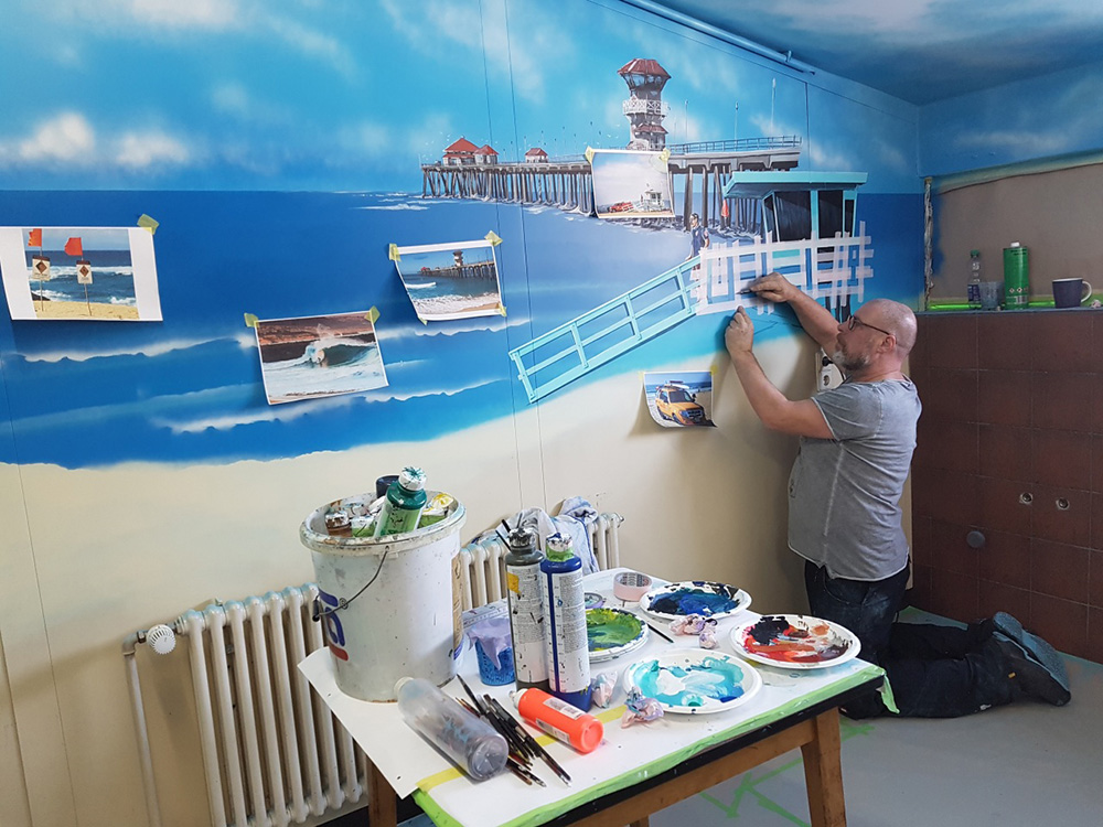 Denn Europapark Künstler Bernhard Hauns hat den Pausenraum in eine Bully-Beach & Gute-Laune Location verwandelt.